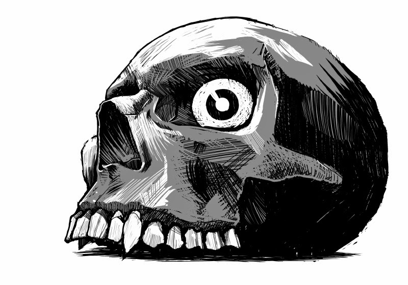 About halfway through I realised it would look much better if Cannonbridge's face appeared naturally in the negative space left by the torn holes, rather than just plonked as silhouette at the bottom. It meant a bit more work, but was a million times cooler than the incongruous silhouette I had on the rough. Glad I thought of it too, as it's the kind of thing you'd come up with afterwards and kick yourself for not doing.